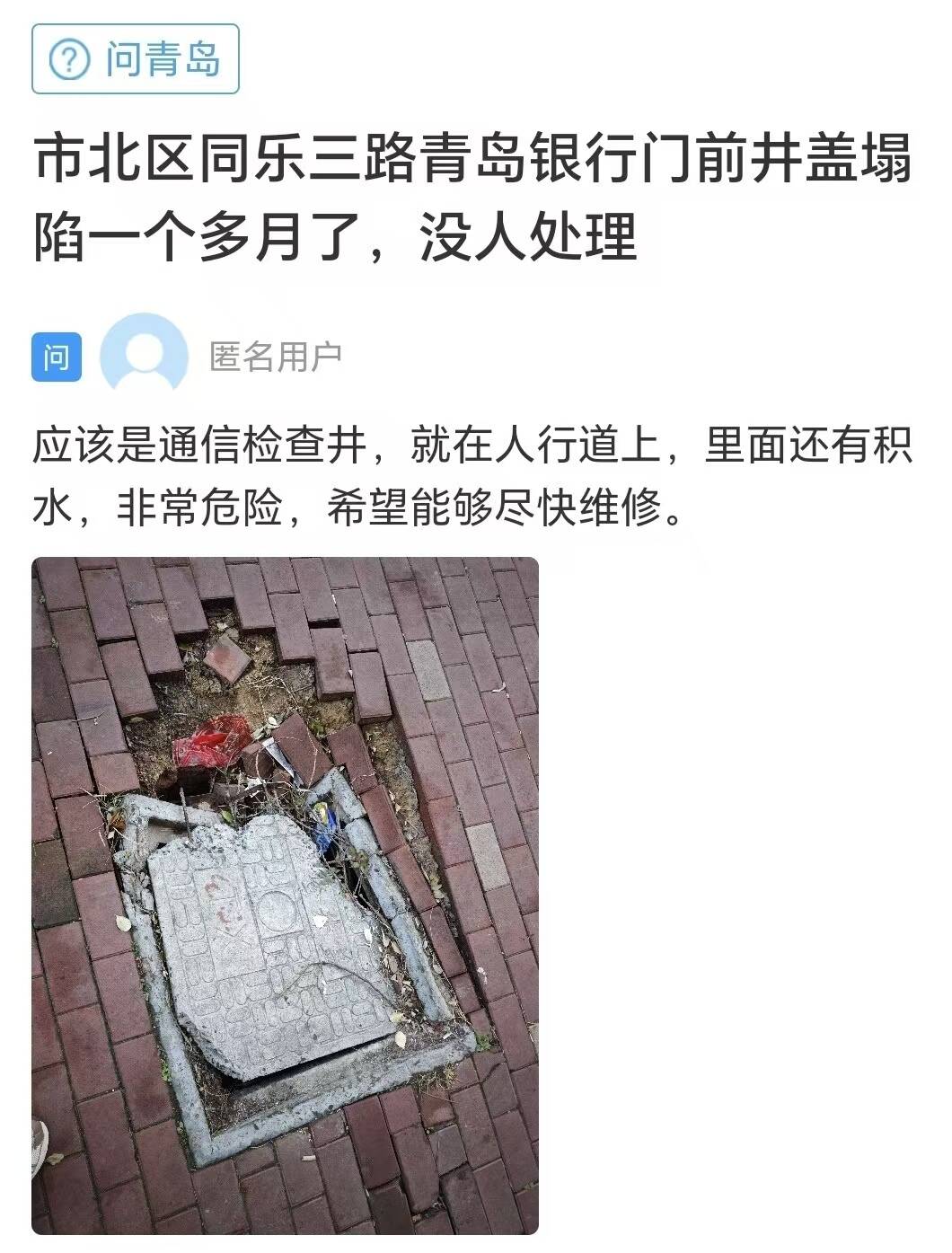 青岛的一位网友在闪电新闻网络问政渠道留言说:市北区同乐三路青岛银行门前,井盖陷落一个多月了,没人处理。陷落的井盖在人行道上,里边还有积水,很风险。期望能够赶快修理。