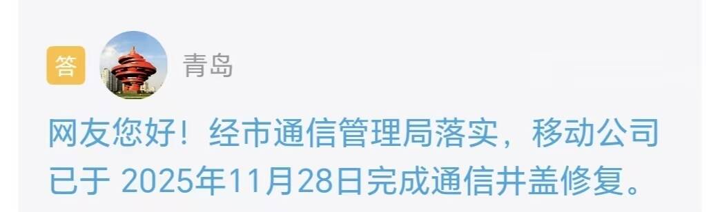 收到留言后,青岛市进行了处理并回复,经市通讯管理局执行,移动公司已于 2025年11月28日完结通讯井盖修正。